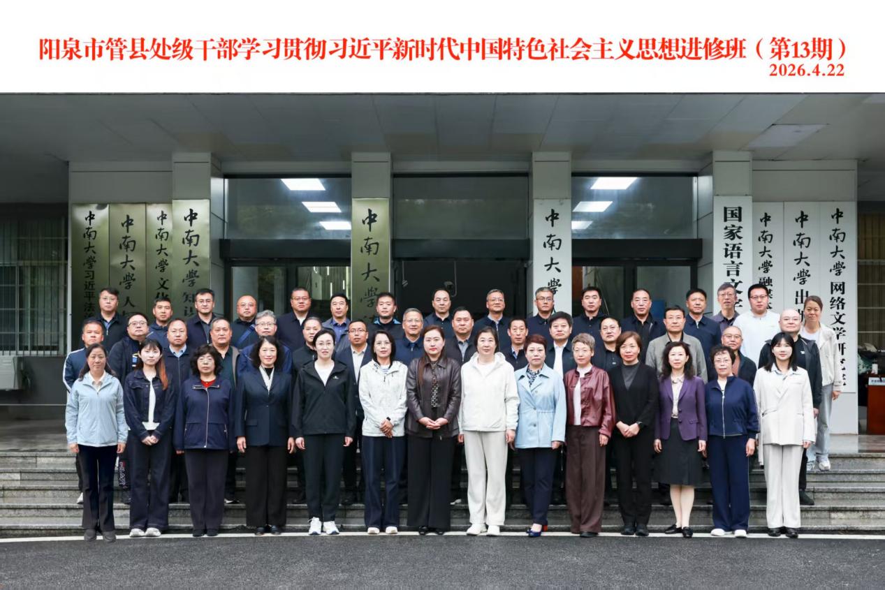 2026年4月21日至4月26日期间,由中南大学法学院公务员培训中心承办的阳泉市管县处级干部学习贯彻习近平新时代中国特色社会主义思想进修班(第13期)在中南大学顺利举行,全班共计45名学员参加此次培训。